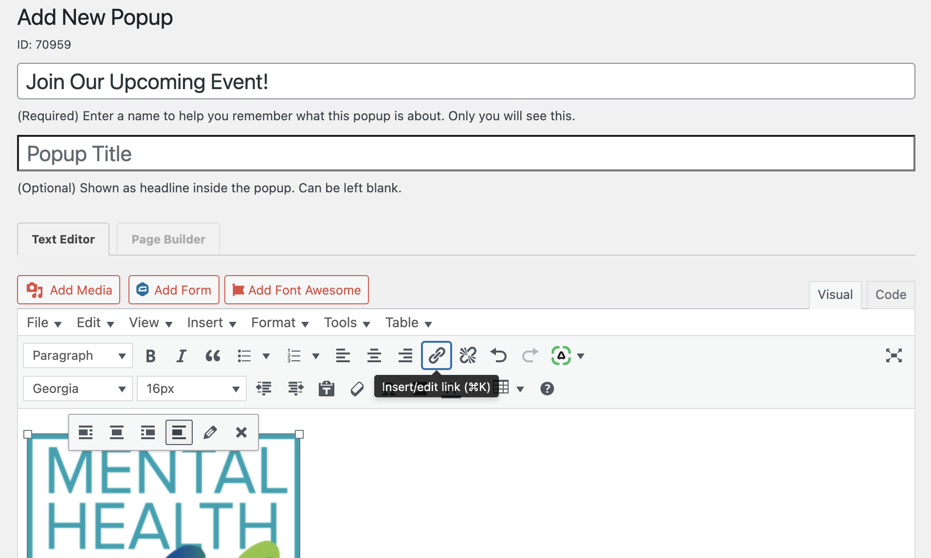 Next, enter the content of the popup. To set up a popup that displays an image with a link, click the Add Media button and choose your image. Then, click on the image to select it and use Insert/edit link to add your link on the image. If you are linking to an external site, select "Open link in a new tab" to keep visitors on your site after they click on the popup.