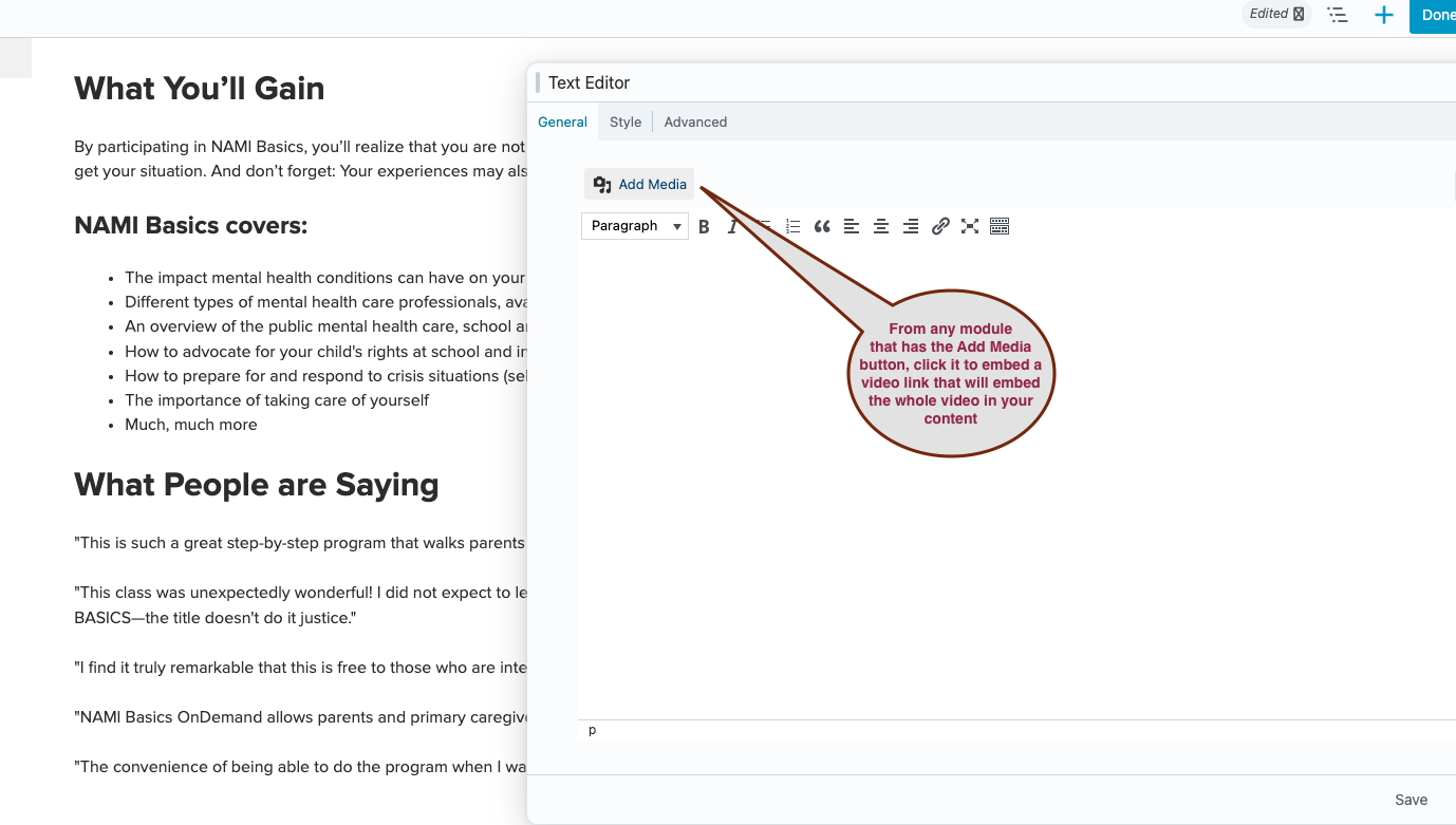 The screenshot below shows what happens after you click the Add Media button and paste in your video URL. Click insert into post, and a video player with your video will be added to the page/post.