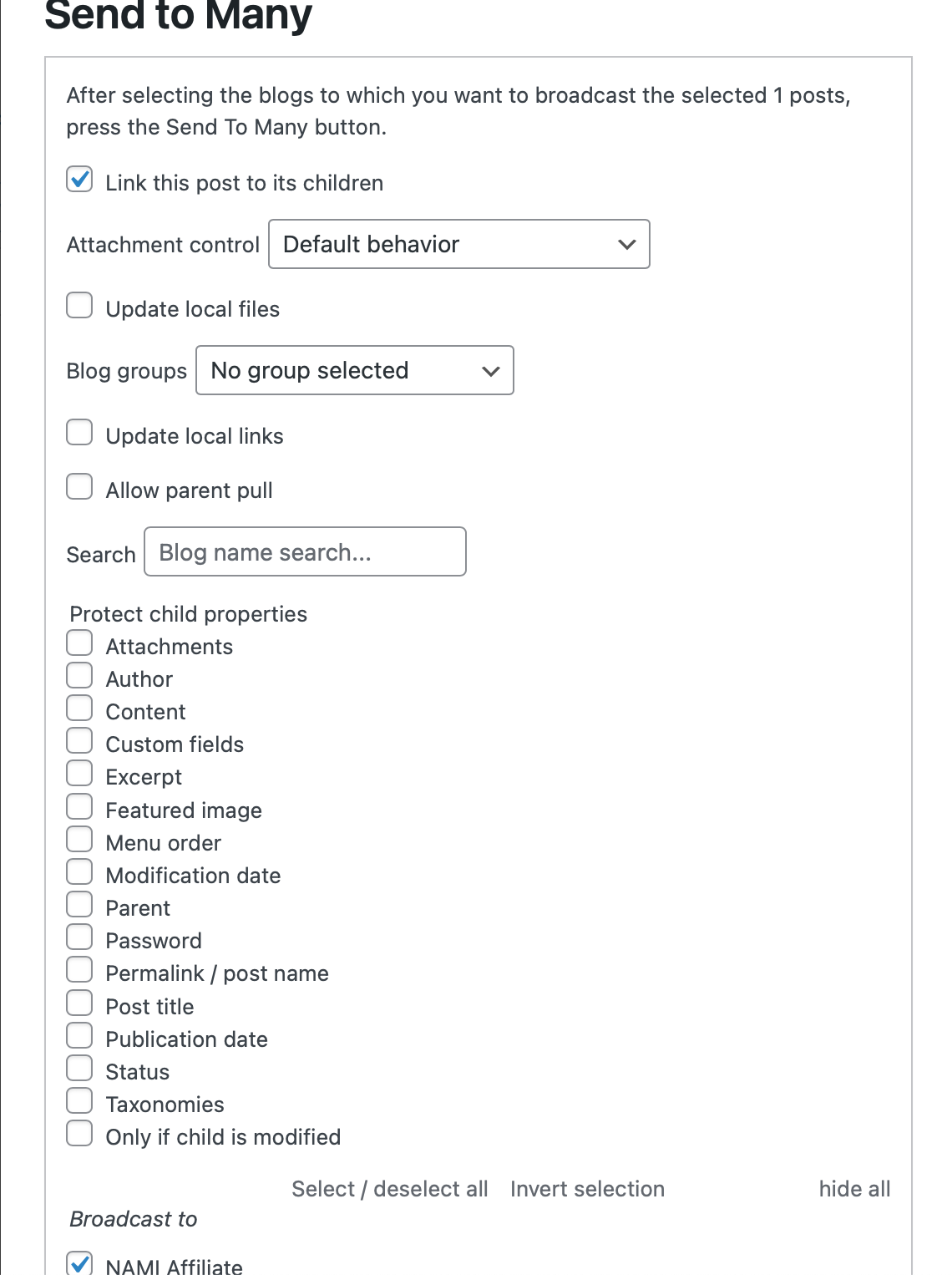Send to Many Publishing uses a parent / child paradigm: when a post is sent to another site – and left as linked – it becomes a parent post to one or more child posts. Each parent can have one child post per blog.