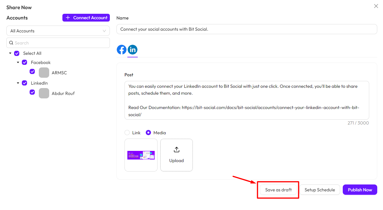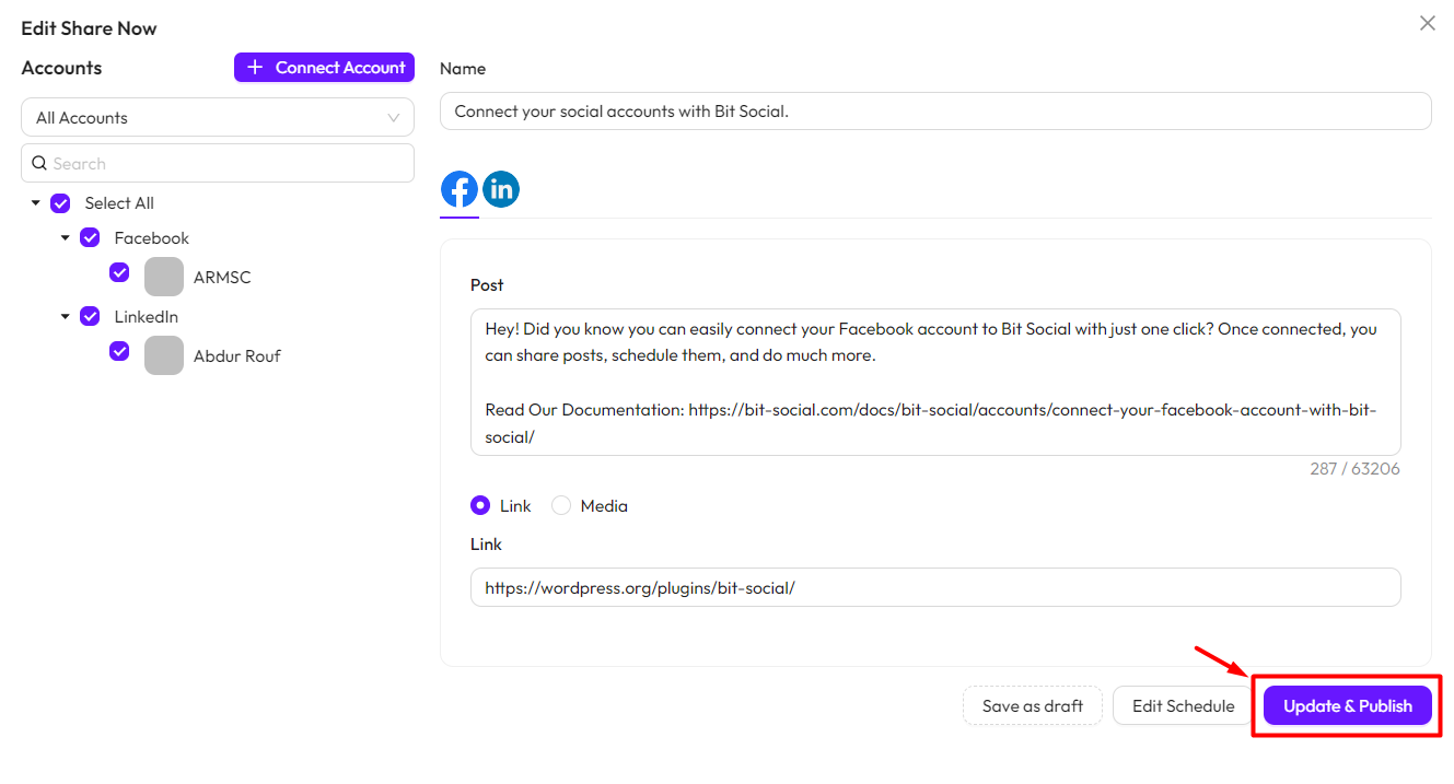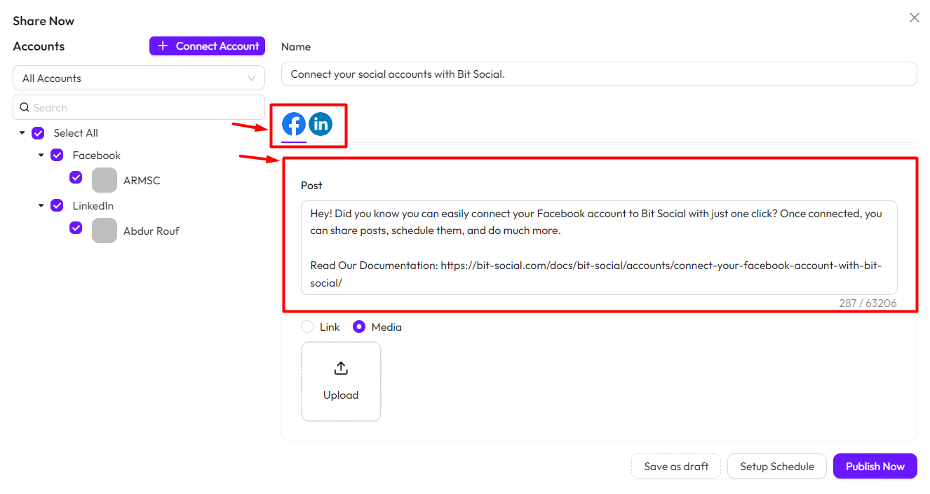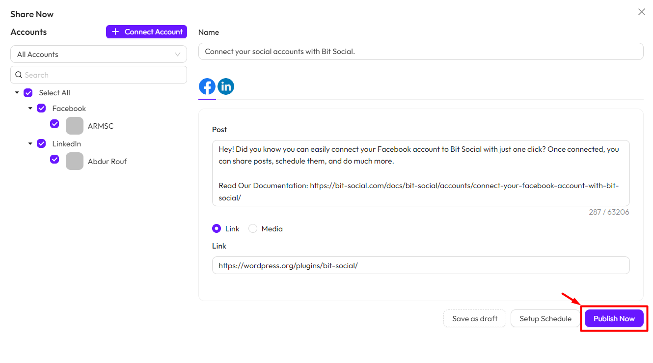 *Note* To use this feature, you must connect your social accounts with Bit Social. Follow this documentation to connect your accounts.