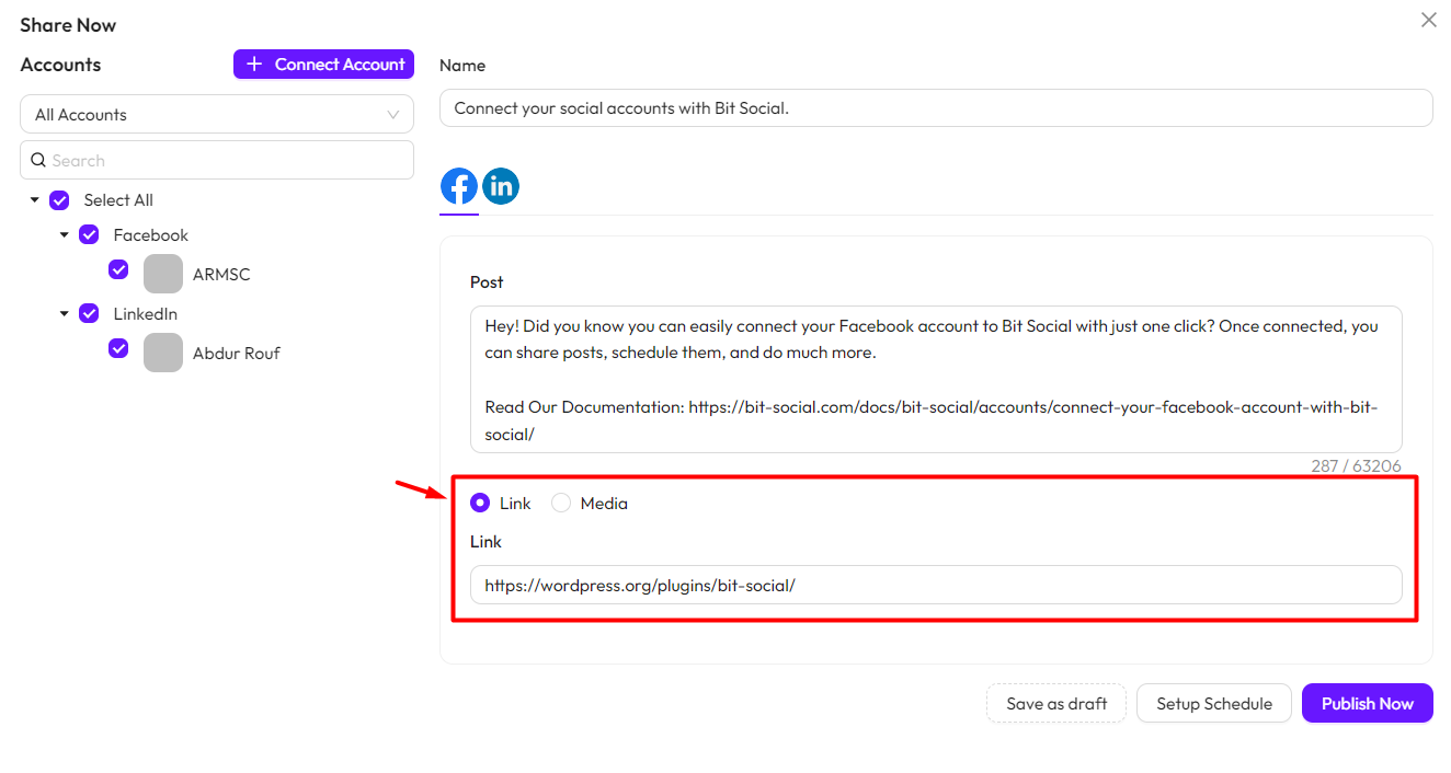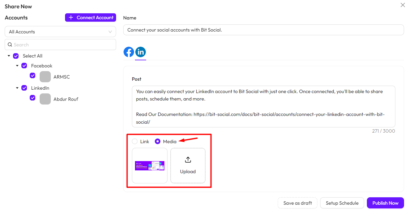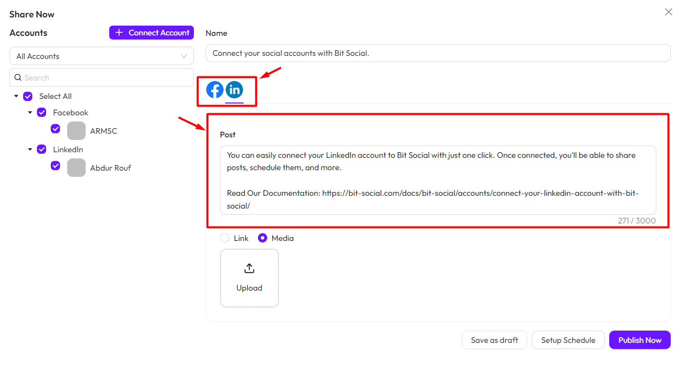You can also share links and upload media when posting. You’ll need to upload media and add links separately for each social platform.