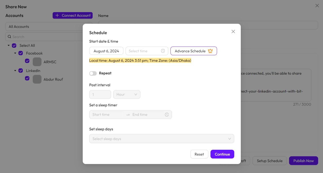 If you click the “Setup Schedule” button, a popup will appear. Set your schedule date and time in the popup, and your post will be published at the scheduled date and time.
