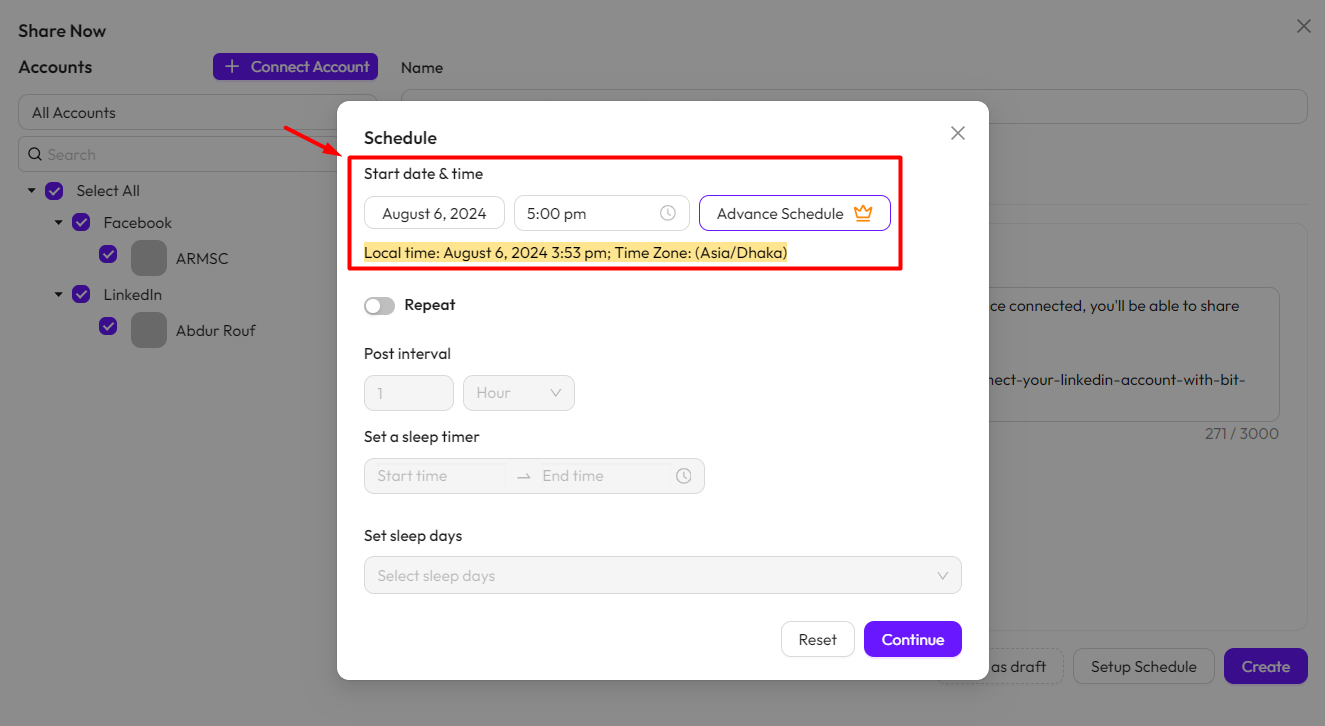 Start date & time: Set your start date and time for sharing. Your post will automatically be shared to your connected platforms at the specified date and time. You can also view the local time.