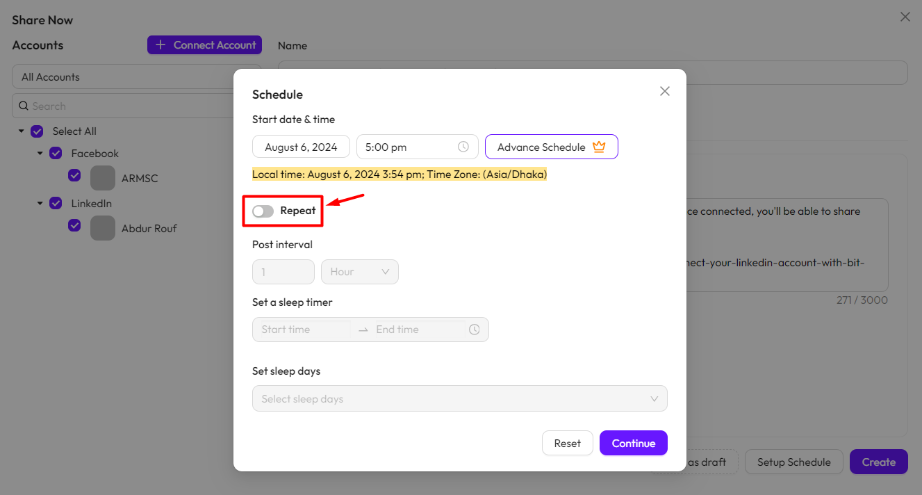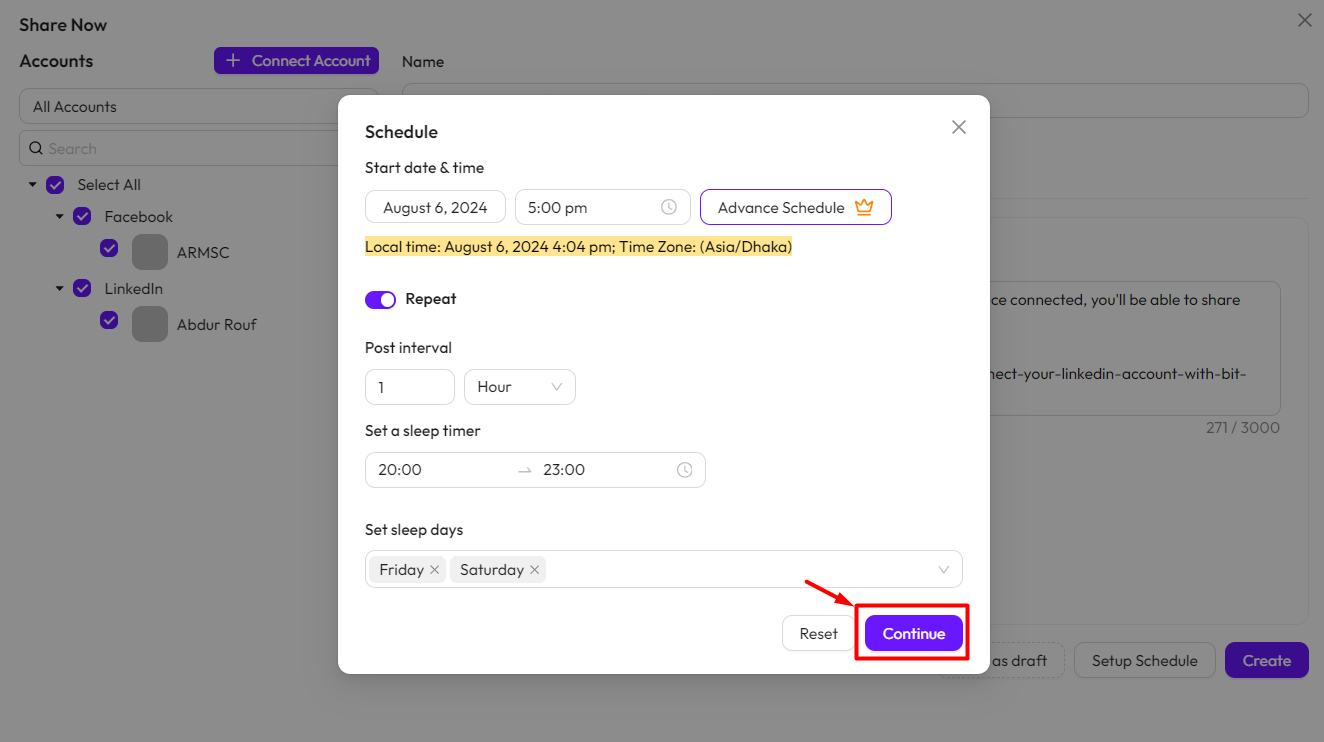 After setting up the schedule, click the Continue button. You can also reset the schedule by clicking the Reset button. Then, click the Create button.
