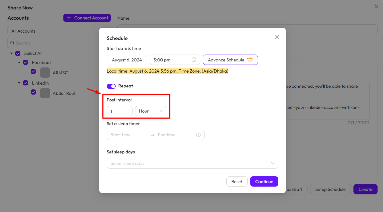 • So start time is 5:00 PM and the first post time will publish at 5:00 PM. Next post will publish at 6:00 PM.