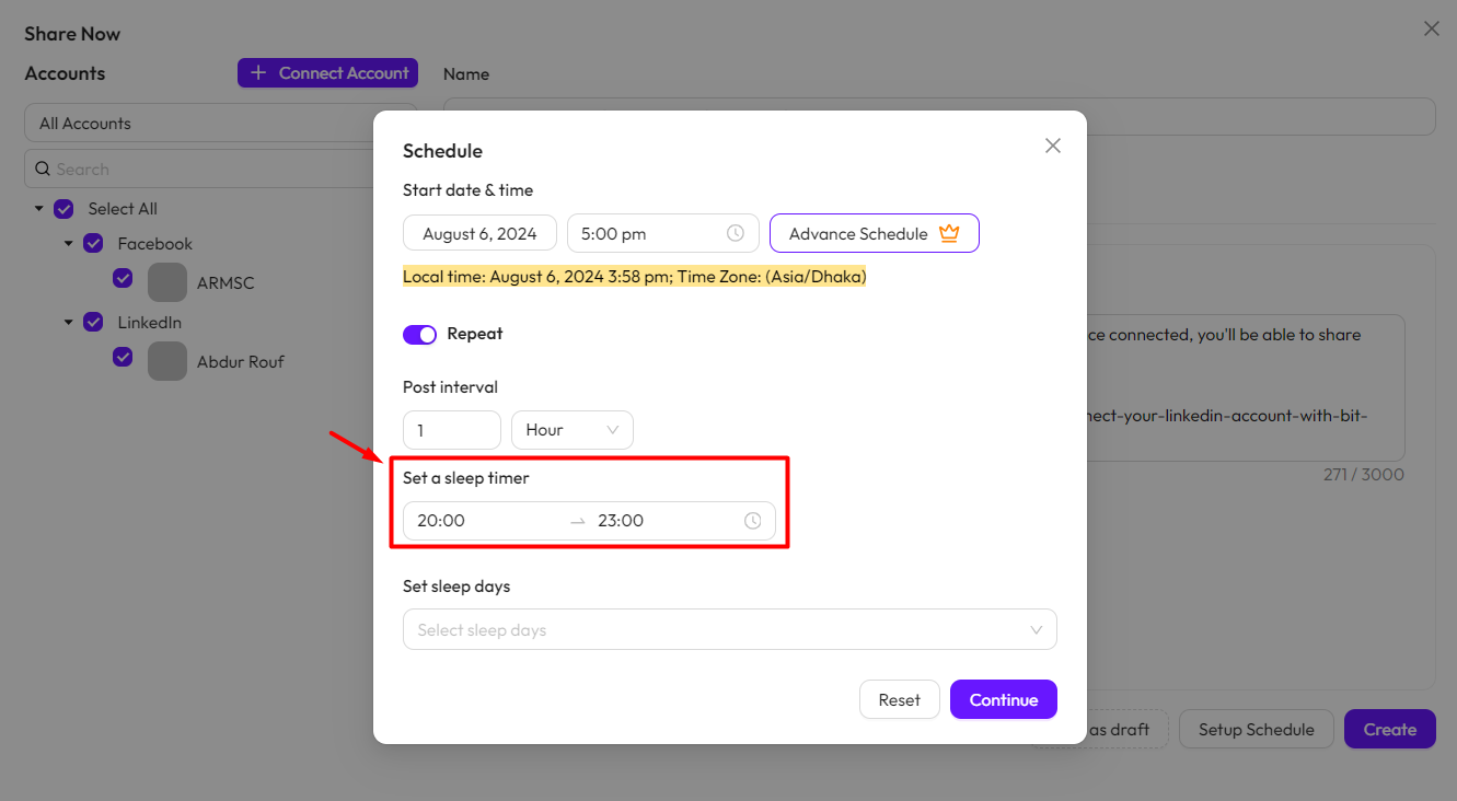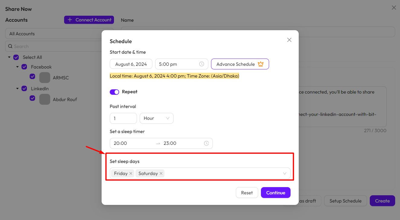 Set sleep days: This feature lets you choose specific days when the plugin won’t share your posts. It’s like giving the plugin scheduled days off, ensuring it takes a break on those selected days.